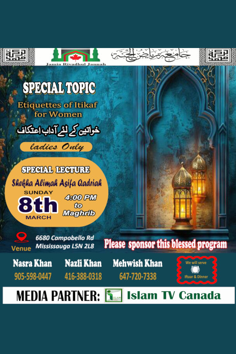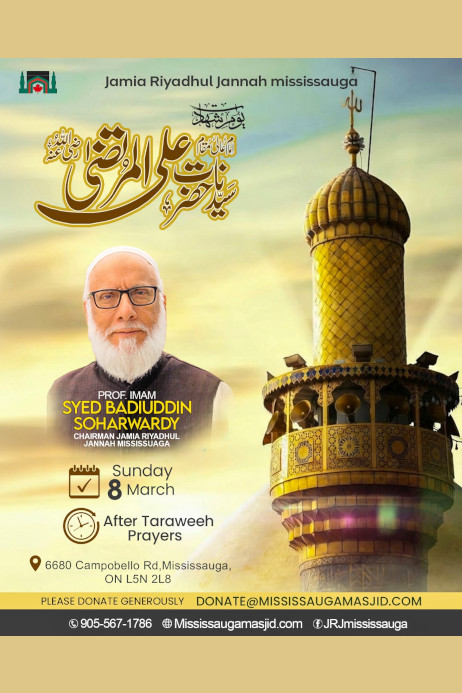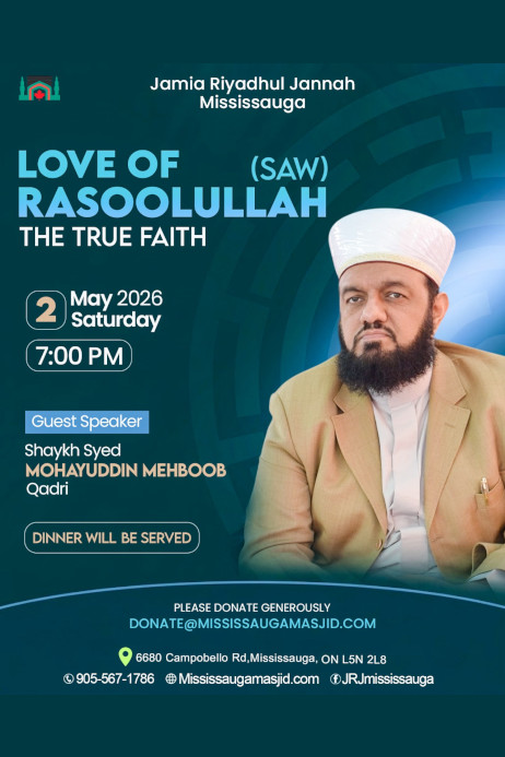 By the Grace of Allah and by the Blessings of Rasoolullah (ﷺ PBUH) Jamia Riyadhul Jannah is an Ahlul Sunnah Wal Jama’ah Masjid. This masjid was established in 2010 by the Canadian Society of Peace and Relief (CSPR) and under the supervision and guidance of Prof. Imam Syed Badiuddin Soharwardy. Canadian Society Peace and Relief which is a registered charity in Canada.